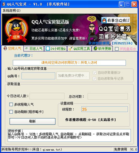 是一款针对空间发烧友、专门代刷流量的用户的.用于提高qq空间流量-网页pv(访问量),uv(独立访客),ip(独立ip)等的免费网络推广软件。