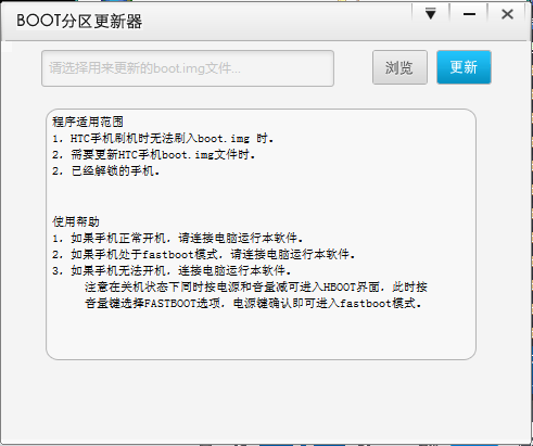 boot分区更新器是目前非常实用的安卓刷机辅助类小工具,此工具运行于pc端,专门为特定人群开发设计。当htc手机无法刷入boot文件,或者需要更新boot分区时,方便、快速地帮助用户完成更新和替换,其过程不需要用户做任何操作,安全、简便。
