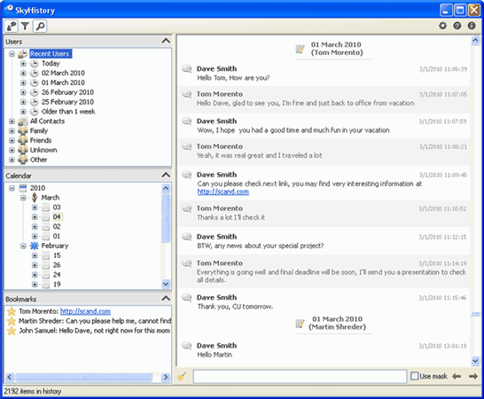 SkyHistory将提供您轻松选择,Skype联系人的聊天记录,你要存储的可能性。您可以快速,轻松地查找到哪个聊天室或即时消息,使用搜索和过滤系统,常见的Skype用户组,最新的历史会议或Skype内置的日历。您也可以挑出重要的信息,将它们添加到您的书签或删除不必要的邮件,甚至聊天会话。