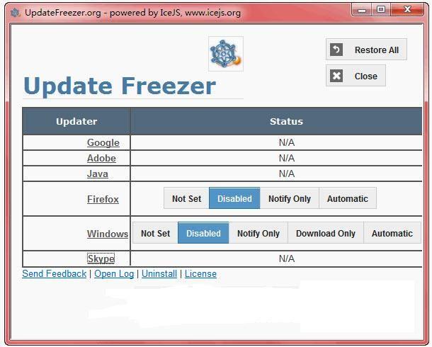 Update Freezer 可以方便地设置 Google、Adobe、Java、Firefox、Windows、Skype 的自动更新功能 ,并可一键还原。
