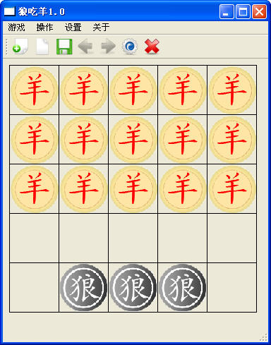 行动方式:狼先行动。狼和羊轮流行动,每一回合只能移动一个棋子,一个棋子一次只能上下左右移动一格。