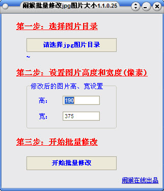 闹猴批量修改jpg图片大小是一款可以帮助用户修改指定jpg图片目录下的文件大小的工具,该工具方便了那些日常图片处理量比较大的用户,使用非常简单,操作也很方便,是用户处理图片大小的好帮手。该软件只支持jpg格式的图片。