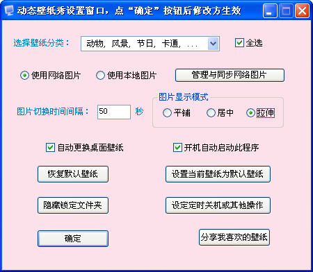 从网上下载好压缩包后,双击压缩包中的"setup_dynamicwp.exe"进行安装,安装完毕软件会自动运行,在弹出的“设置窗口”中,选择壁纸分类,目前包括“动物, 风景, 节日, 卡通, 美女, 汽车, 帅哥, 宝宝, 游戏, 其它,清凉美女,海底世界”十二大类,默认是选中“使用网络图片”,软件会自动帮你从网上下载你选定类型的图片,你也可以选择“使用本地图片”,然后你可以自行到网上下载各种精美壁纸图片,按照软件生成好的“pictures”文件夹下的各种图片类别,放置你所自行下载好的图片,之后你需要点“设置窗口”中下方的“确定”按钮,保存你所作的更改,软件就可以自动帮你定时切换背景图片了。对于已经下载好了的网络图片,你也可以点设置窗口中的“管理与同步网络图片”,就可以把已经从网上下载好的图片复制到本地图片文件夹,或者过滤掉你不喜欢的网络图片了。