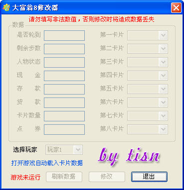 可以修改玩家(包括电脑)的各种数据,现金、存款、贷款、点券,还可以修改卡片,一共49种卡片,可任意修改!
