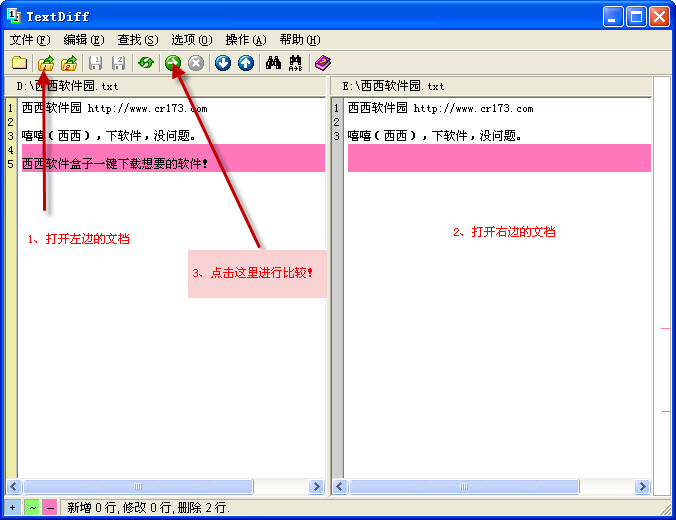 如果两个文本文档内容很多,你想找出它们之间有哪些差异,哪些被更改了,需要一个对比工具的话,那么TextDiff 中文版是可以用的上的,而且使用非常简单: