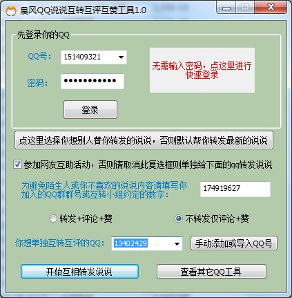 QQ说说互转互评互赞工具,轻轻松松让你的qq说说热闹起来!你可以找到兴趣相投者互相转发对方的说说,或者仅仅是评价和赞扬对方的说说。