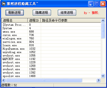 雅熙进程隐藏工具它的强大之处在于,隐藏的不仅仅是进程列表,其它程序也未必能检测到你所隐藏的进程。工具简单好用,绿色免费。值得亲们一试!