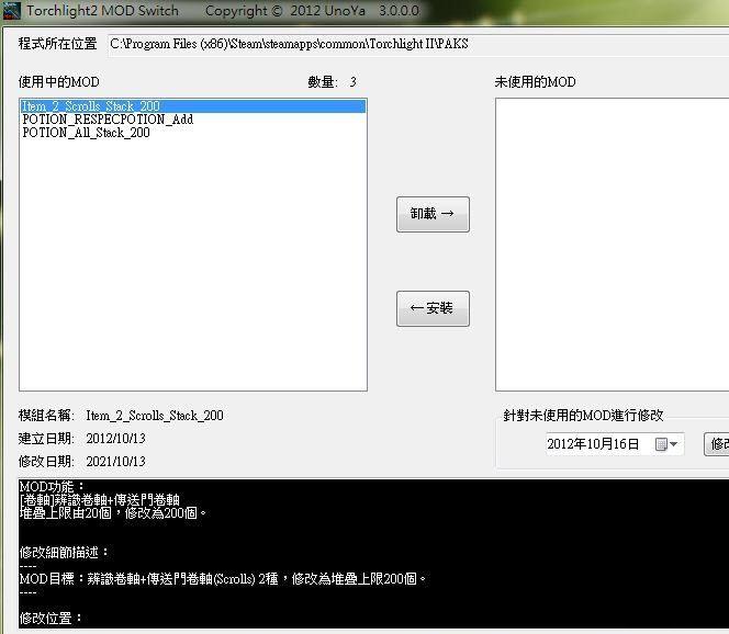 [卸载] 当您点击 "使用中的MOD区" 某一项时, 会将此项移到 "未使用的MOD区", 这表示该MOD在火炬2启动后就不会载入了.
