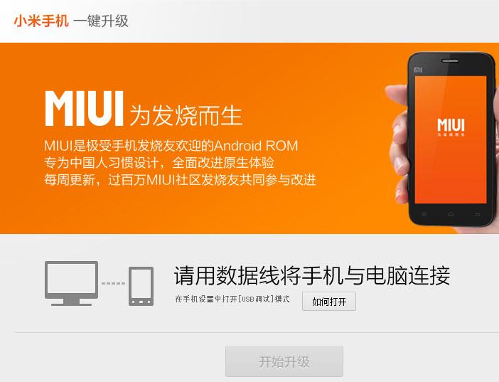 小米官方推出的小米手机一键升级工具,是专门针对小米手机定制的,能够实现快速无缝的升级小米手机系统,无论你的小米手机是MIUI2.3 还是 MIUI V4 都能通过该工具升级至最新的稳定版。