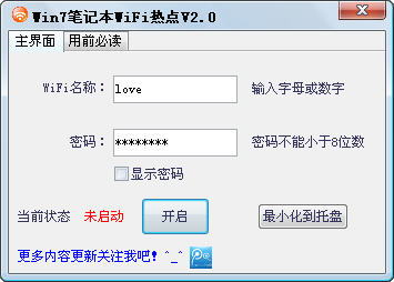 青青草原WiFi热点是一款简单好用的Win7笔记本WiFi热点创建共享工具,能让win7系统的笔记本电脑变成一个wifi热点,让其他设备共享网络,启动更快更简单!软件仅支持win7系统。
