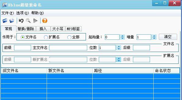 Eblue超级重命名是一个帮助用户批量更改文件名称的软件,支持对大量文件进行批量重命名,并且能够根据文件特征进行重命名(对于MP3文件的支持尚未完善,不建议现在使用MP3标签批量重命名功能)。