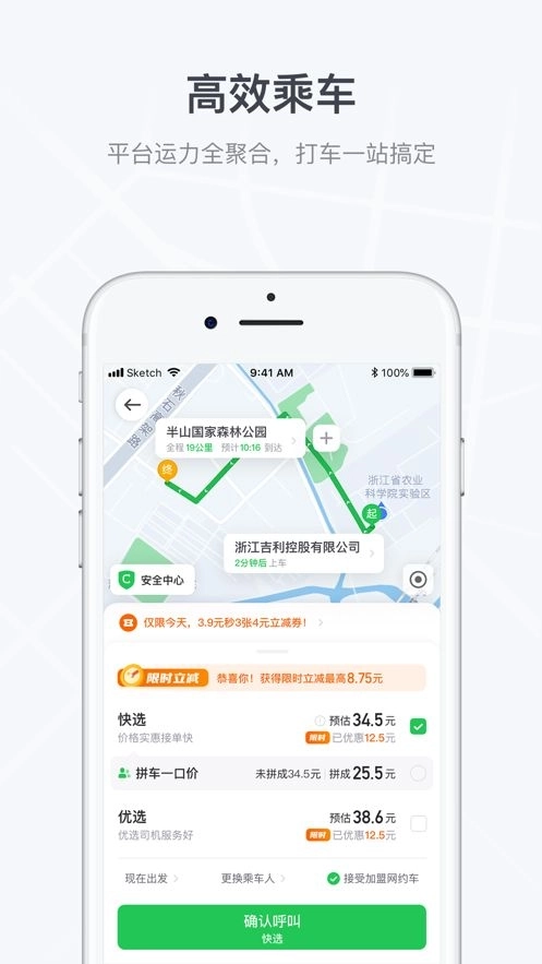 2. 订单明确、定位精准,智能算法快速调度接单车辆及路线,可设定多处行程终点,途中导航简便易用。
