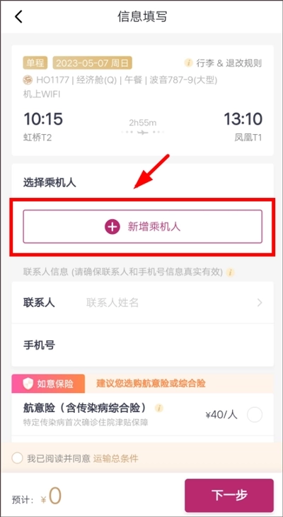 (4)然后填写乘机人信息,填写完成,点击【下一步】,进行付款购买即可。