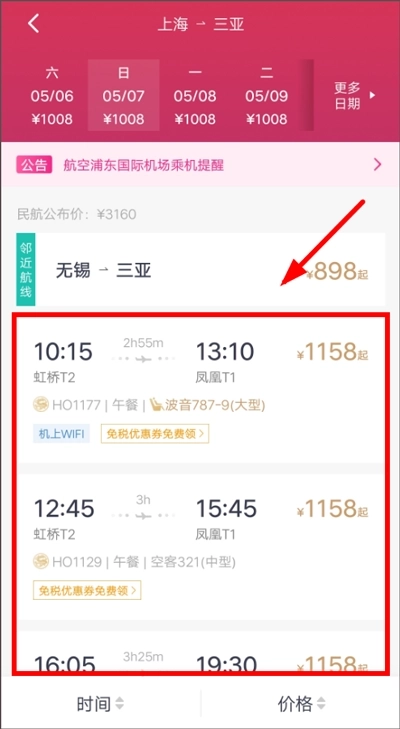 (2)在查询结果页面,用户可根据自己的出行时间或是其他需求来选择合适的机票来购买;