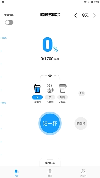 3、一键打卡 - 省去繁琐的记录流程,一键记录喝水饮品和饮水量。自定义设置常用饮品和杯量,让记录变得更简单