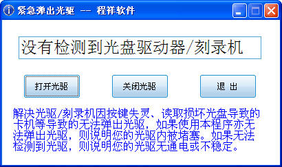 解决光驱/刻录机因按键失灵、读取损坏光盘导致的卡机等导致的无法弹出光驱,如果使用本程序亦无法弹出光驱,则说明您的光驱内被堵塞。如果无法检测到光驱,则说明您的光驱无通电或不稳定。