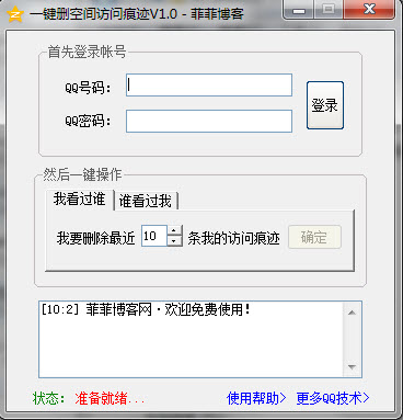 2、本程序既可以帮你删掉你曾经访问过的空间痕迹,又可以用来删好友们访问你的空间留下的记录。也就是分别对应软件中的“我看过谁”和“谁看过我”。接着菲菲博客的童靴们还可以任意指定想要删除最近多少条的记录(默认的不改也行),然后点“确定”提交删除请求即可。