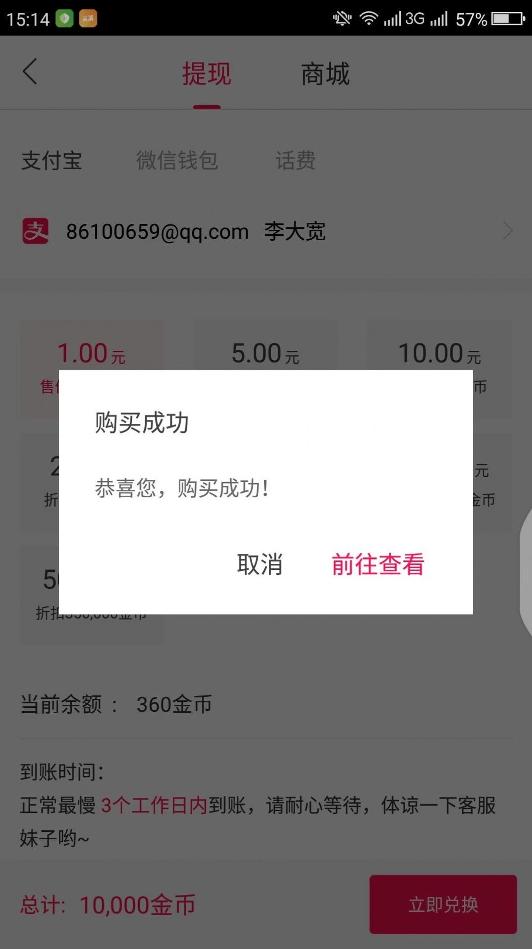 1.兑换模块包括实物商品和提现充值两种商品类型。实物商品包括日常洗护用品、出行箱包、纸巾和其他精美礼品,提现充值功能。