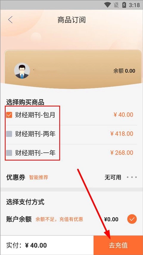 3、进入订阅页面,商品订阅分为财经期刊包月、一年、两年等,用户可以选择适合自己的量力而为订阅,选择支付方式支付即可订阅成功。
