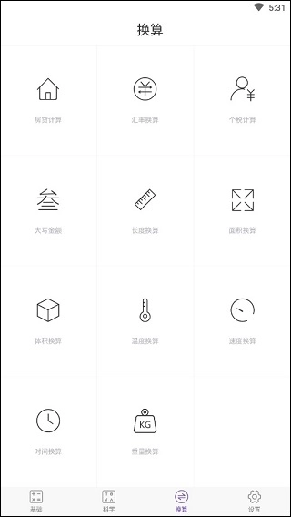 4、在“换算”功能系统里,你可以切换至房贷计算、汇率换算、个税计算、大写金额、畅读换算、面积换算、体积换算、温度换算、速度换算、时间换算及重量换算。