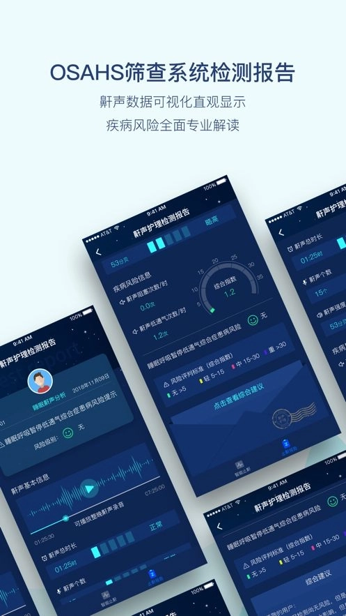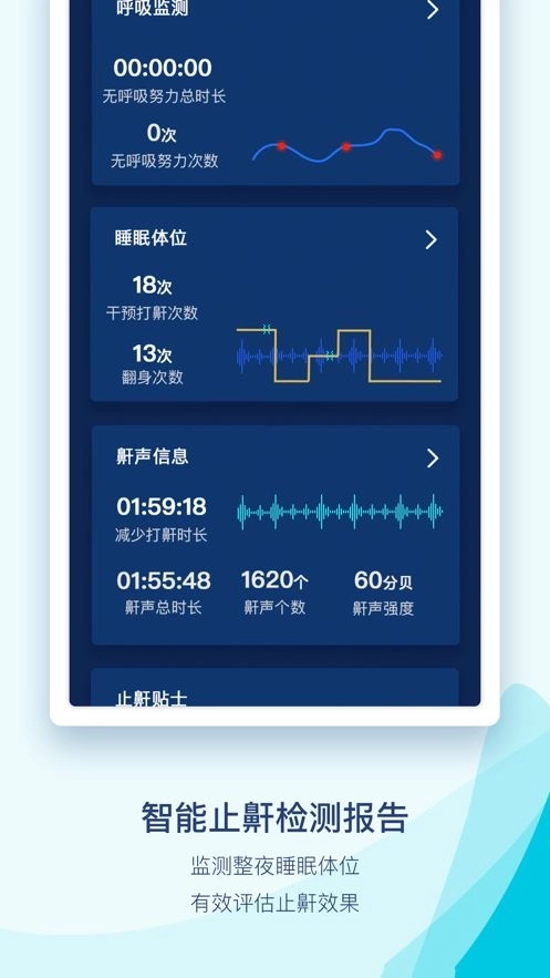 2. 以直观方式呈现产品的止鼾成效,对用户睡眠质量优劣进行评估,并就用户身体可能潜藏的疾病风险发出预警。