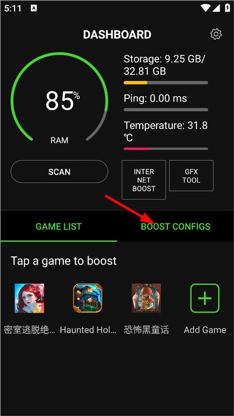 1. 用户开启增压+app,进入主界面,在此页面,用户能够查看手机电量、内存、温度等信息,接着点击GAME LIST里的“+”。