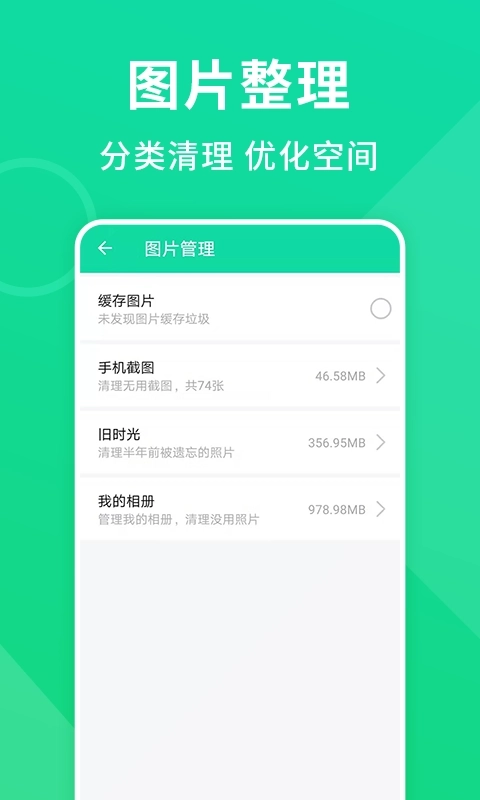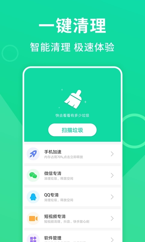 1、这款绿色手机清理工具,能迅速为手机清除全部无用垃圾,避免无用垃圾持续占据手机内存。