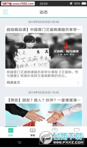 2. 能够观看课程,课程类别包含全部课程、直播以及精彩视频,课程内容通过动态方式获取。