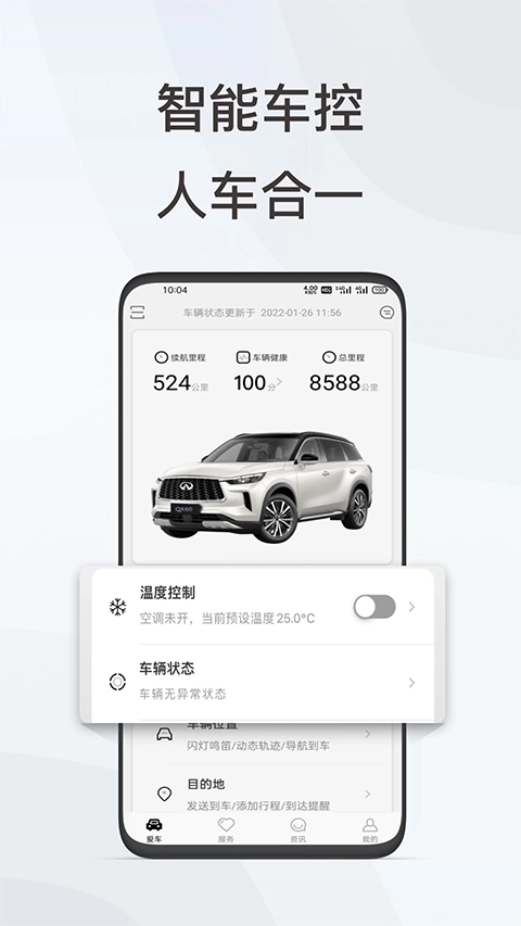 英菲智联APP,由东风英菲尼迪汽车有限公司专为旗下智能网联汽车打造,是一款车主服务软件。它带来了前所未有的智能化科技服务与个性化出行体验,使用户能够随时知晓车辆状况,同时畅享优质的车载娱乐服务。当下,英菲智联APP仅适配英菲尼迪2022款QX60车型,能为用户供应资讯、维修保养、道路救援、智慧加油、车辆位置、车辆状态、贴心导航等功能服务。特别是车辆位置功能服务,可实现车辆定位,并提供寻车路线指引,助力用户在复杂环境中迅速且便捷地找到自己的爱车。