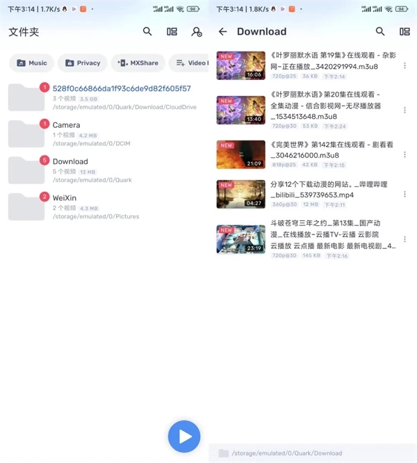 3、支持自动扫描手机内的视频,也可以按目录浏览播放。