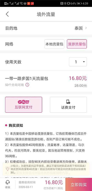 2、在购买页面,需先选择目的地国家/地区,接着选择使用天数与支付方式,最后点击“立即购买”。