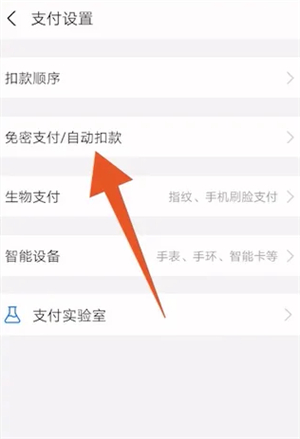 翻转到支付设置界面后,点击上面的免密支付/自动扣款进入。