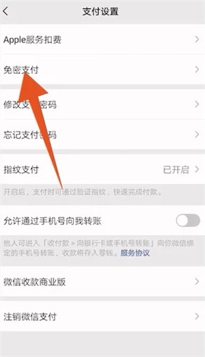 翻转到支付设置界面后,点击里面的免密支付选项进入。