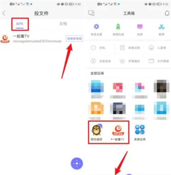 最后在文件投送界面,大家直接点击手机刚下载好的文件“安装到电视”,电视便会自动同步安装。此外,在悟空遥控器应用的“工具箱”里,也能看到已成功安装的电视应用。