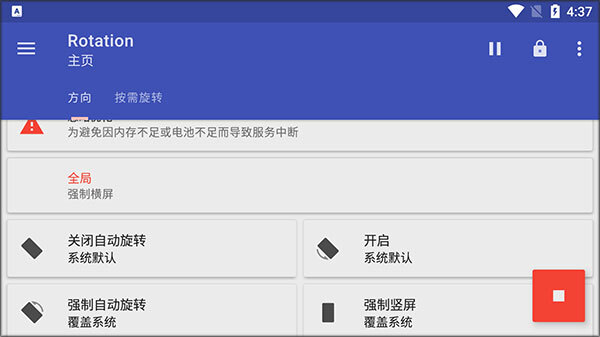 7、开启权限后就能进行横屏操作,随后点击右下方的按钮,便可停止服务,屏幕方向也会恢复默认状态。
