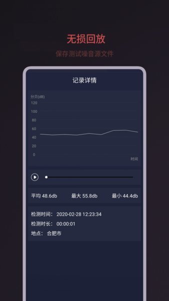3、测量结果的图表呈现出最小分贝值、最大分贝值以及平均分贝值。