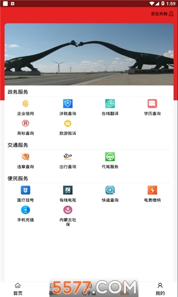 服务中心模块包含代缴电费、违章查询、医疗挂号等便民服务,以及企业信用、旅游投诉等政务服务。