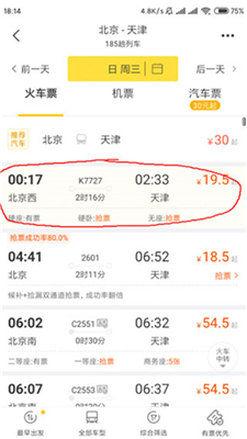 4、点击先要购票的车次,以图中红色圈中车次为例。