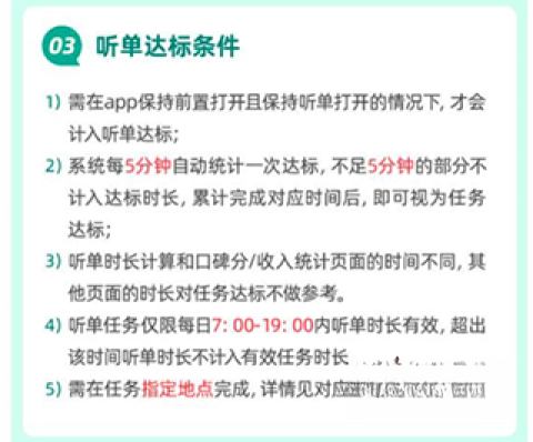 听单任务需始终在前台保持开启状态,同时要设置好听单功能。系统每隔5分钟会对达标情况进行记录,不足5分钟的时长将不予计入。