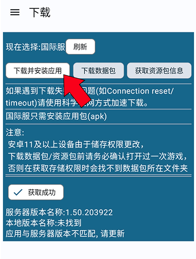 2、等待页面下方显示“数据获取成功”后,点击【并安装应用】,APK将自动完成安装。