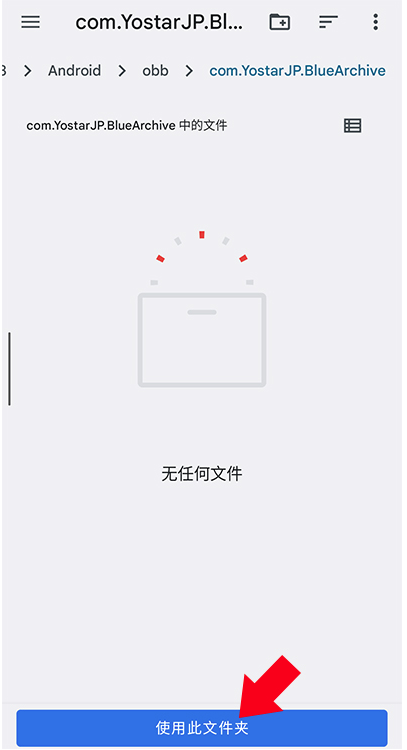 6、系统会跳转至文件管理器,并自动定位到路径:android/obb/com.YostarJP.Bluearchive 。在确认该目录存在之后,点击下方的【使用此文件夹】来完成授权。