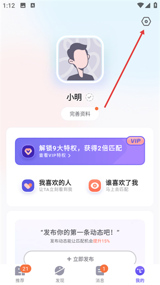 1、在“我的”页面点击右上角设置图标,进入设置界面,可管理账号相关配置选项。