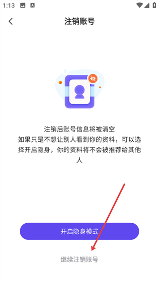 4、在注销账号界面,可选择【开启隐身模式】隐藏资料,或点击【继续注销账号】提交注销申请。