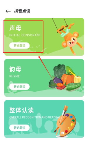 2、在主界面中选择拼音选项,进行跟读练习,以提升语音识别能力和发音技巧。