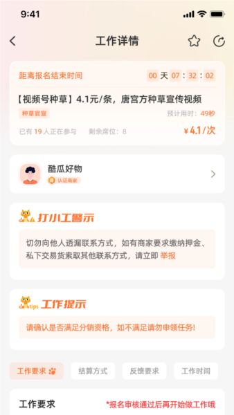 打小工是河南酷瓜信息技术有限公司推出的一款接单赚钱应用,平台会展示详尽的工作信息,每个岗位都配有具体说明,方便用户了解要求并自主选择报名。用户还能实时在线关注岗位动态,快速找到适合自己的任务并一键报名参与,完成任务后即可获得可观收益,积累更多收入。所有报名的任务都能在应用内统一管理,随时掌握各任务的进展情况。有需要的话,欢迎前来体验!