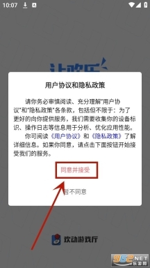 1.安装并打开欢动游戏厅,点击【同意并接受】同意隐私政策