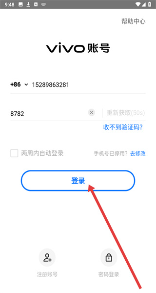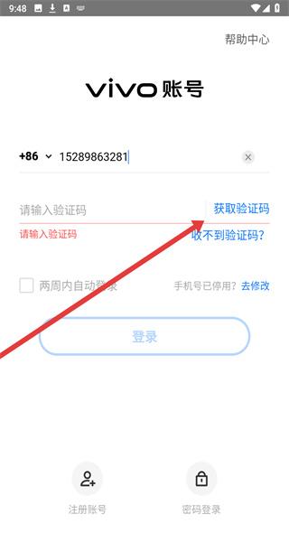 3、进入vivo账号登录界面后,填写手机号并申请获取验证码。
