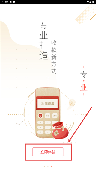 1、在引导页点击【立即体验】按钮,进入合利宝应用的登录流程,开启收款类服务体验。