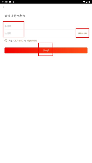 4、在注册页面填写【手机号】,获取验证码并填入,勾选《用户协议》和《隐私政策》后点击【下一步】,继续完成注册流程。