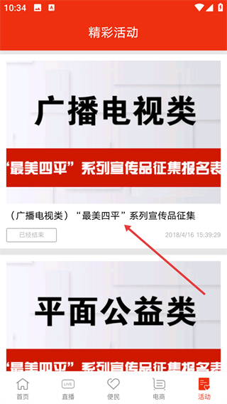 3、在【活动】页面的分类列表里,挑选“广播电视类”这类分类,就能查看相应类别的活动详情,有部分活动会标明状态(例如“已经结束”)。